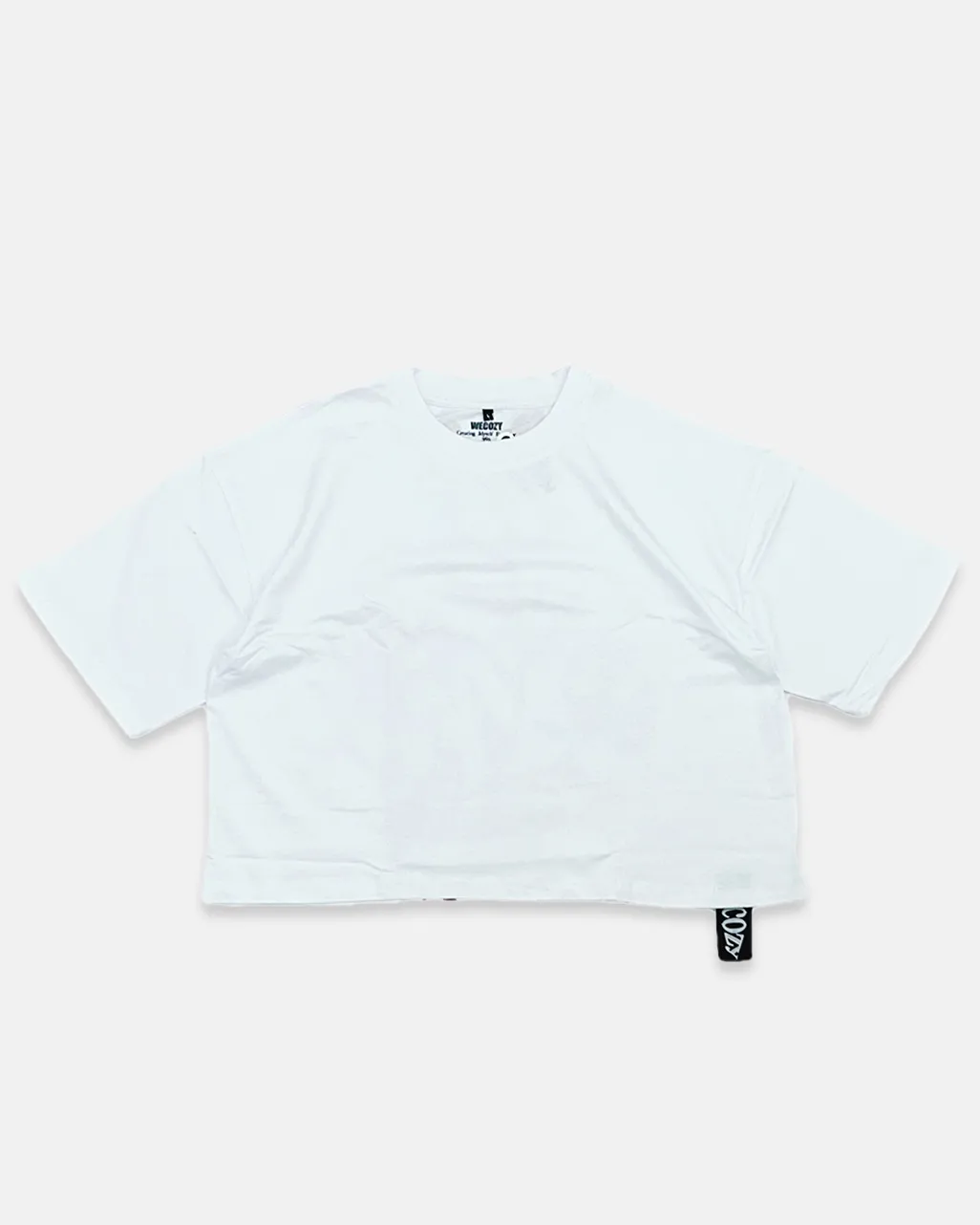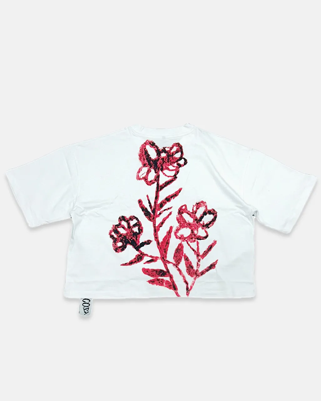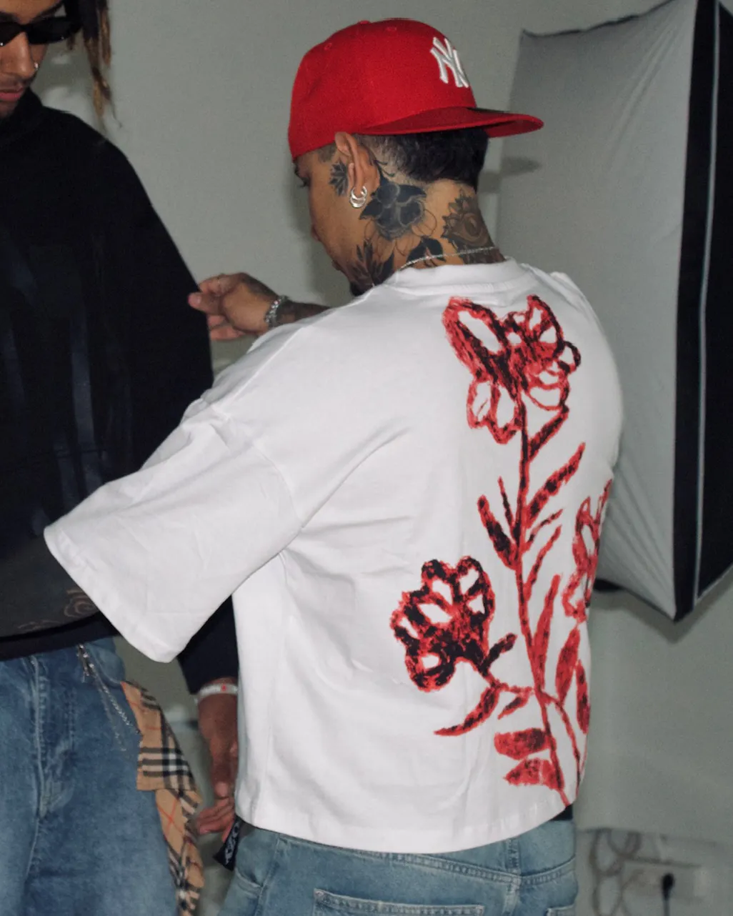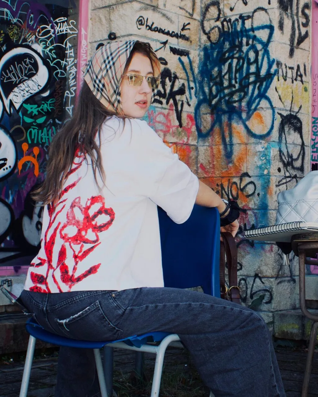 Camiseta blanca con diseño serigrafiado en la espalda.